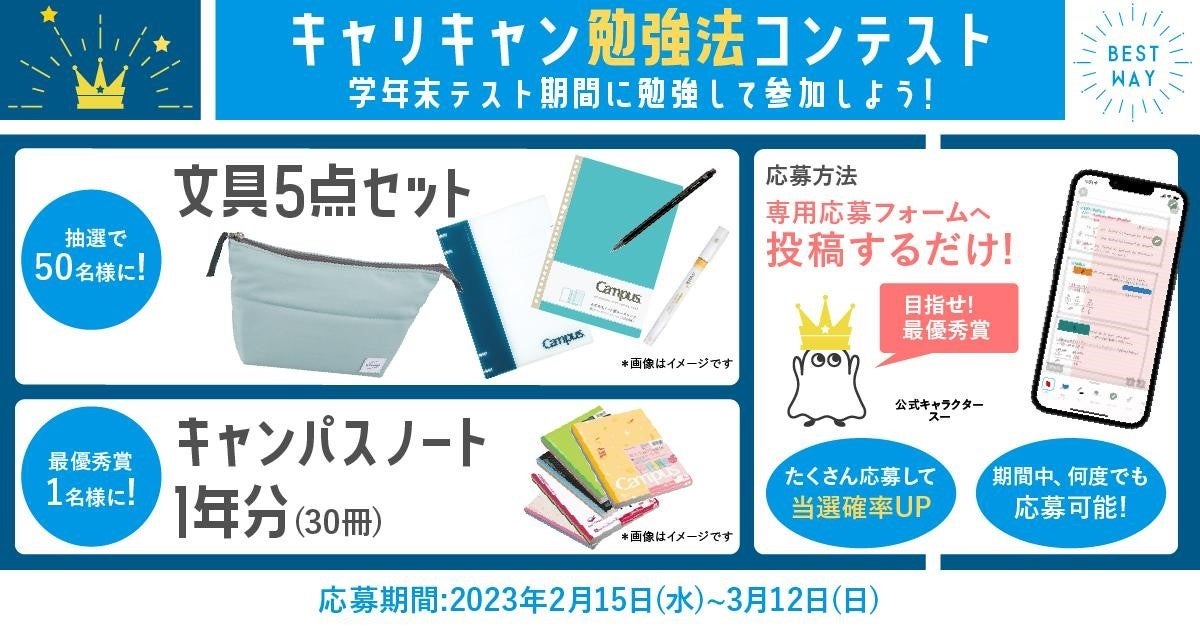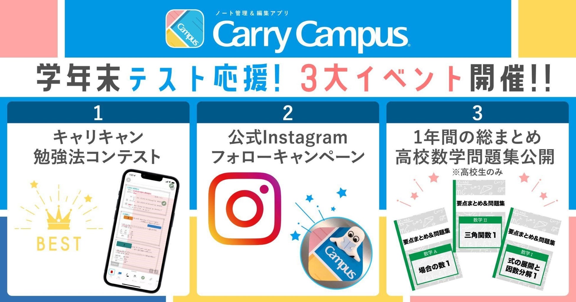 ノートを撮影し、アプリ内で管理/編集できる勉強アプリ「Carry Campus(キャリーキャンパス)」の学年末テスト応援3大イベントがスタートしました。