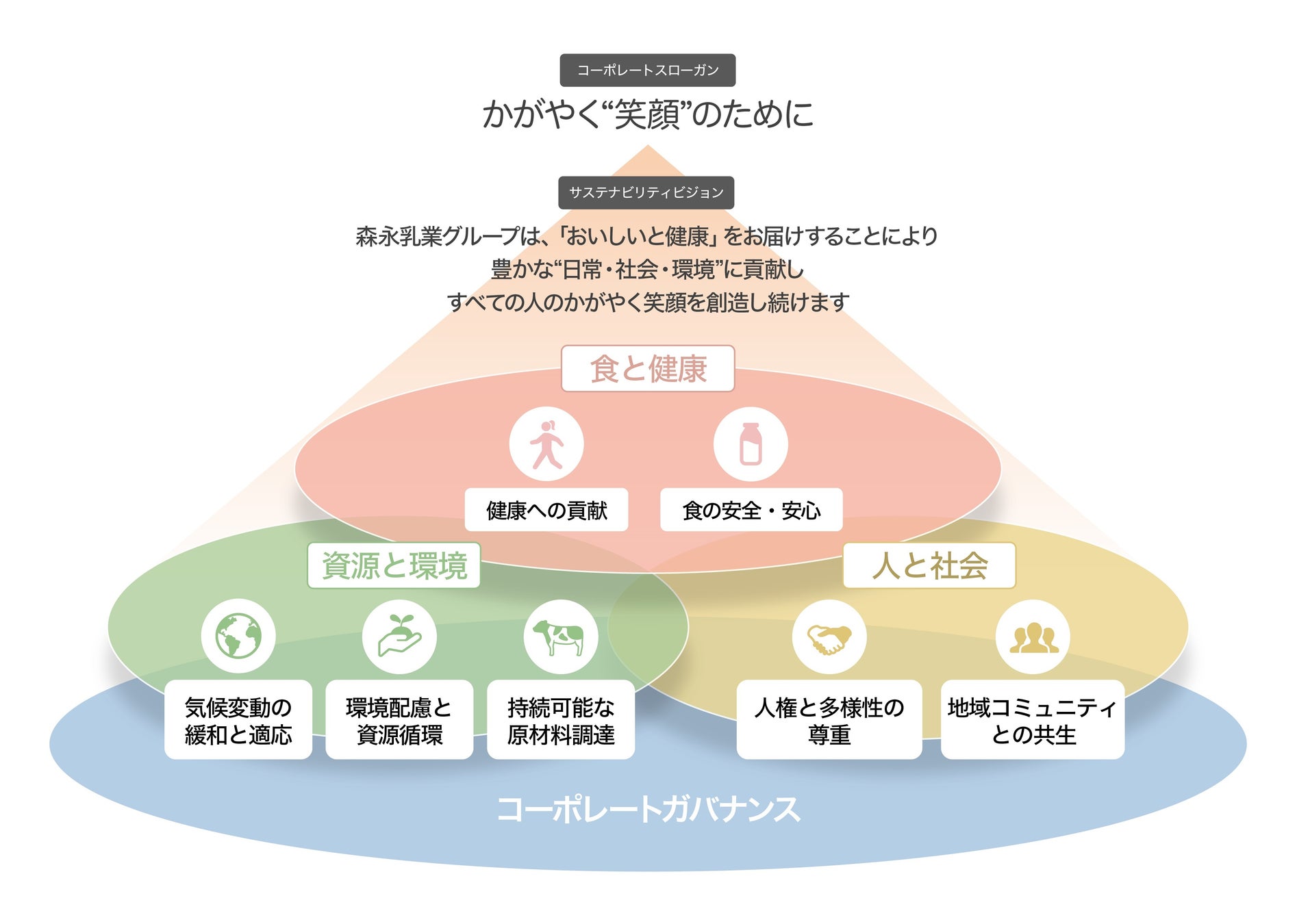 森永乳業グループは、コーポレートスローガン「かがやく“笑顔”のために」のもと、サステナビリティ経営の実現を目指し、「『おいしいと健康』をお届けすることにより、豊かな“日常・社会・環境”に貢献し、すべての人のかがやく笑顔を創造し続けます」というサステナビリティビジョンを掲げています。このサステナビリティビジョンの実現に向けた活動を推し進めるべく、2022年に「サステナビリティ中長期計画2030」を策定しました。『おいしいと健康』 をお届けするための商品の開発・販売、ライフスタイルをより良くするサービスの推進はもちろん、地域コミュニティとの共生を目指し、お客さまの健康で幸せな生活に貢献したいと考えています。