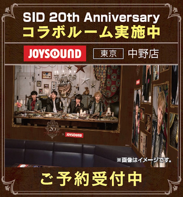 JOYSOUND中野店(東京)に展開するカラオケコラボルームは、ルーム内の壁面やテーブル、ドアに至るまで、「SID 20th Anniversary」の世界観で彩られ、ファンには堪らない空間となっております。