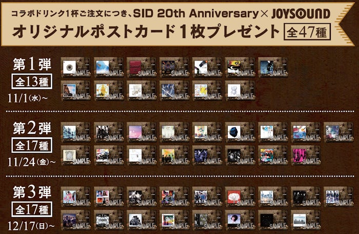 株式会社エクシングの子会社で、全国にカラオケ店舗を展開する株式会社スタンダードは、2023年11月1日(水)から2024年1月8日(月)までの期間中、「SID 20th Anniversary×JOYSOUND直営店コラボキャンペーン」と題し、JOYSOUND中野店(東京)にカラオケコラボルームをオープン!また、JOYSOUND直営店25店舗にて、オリジナルポストカード付きコラボドリンクを展開します。コラボドリンクはテイクアウトも可能です!