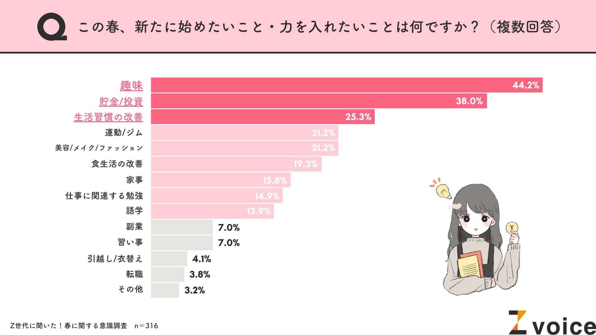 最後に、Z世代がこの春、新たに始めたい・力を入れたいことに関しては、1位に「趣味(44.3%)」、2位に「貯金・投資(38.0%)」がランクインし、昨今の投資ブームが反映される結果に。