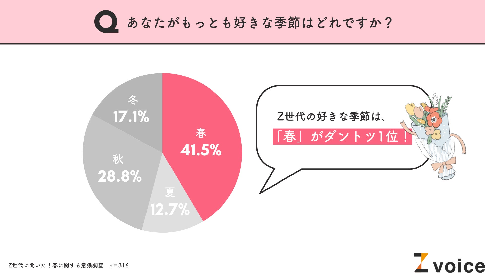 まず、Z世代にもっとも好きな季節を聞いたところ、「春」という回答がもっとも多く、41.5%という結果に。2位の「秋(28.8%)」を大きく離して1位となりました。