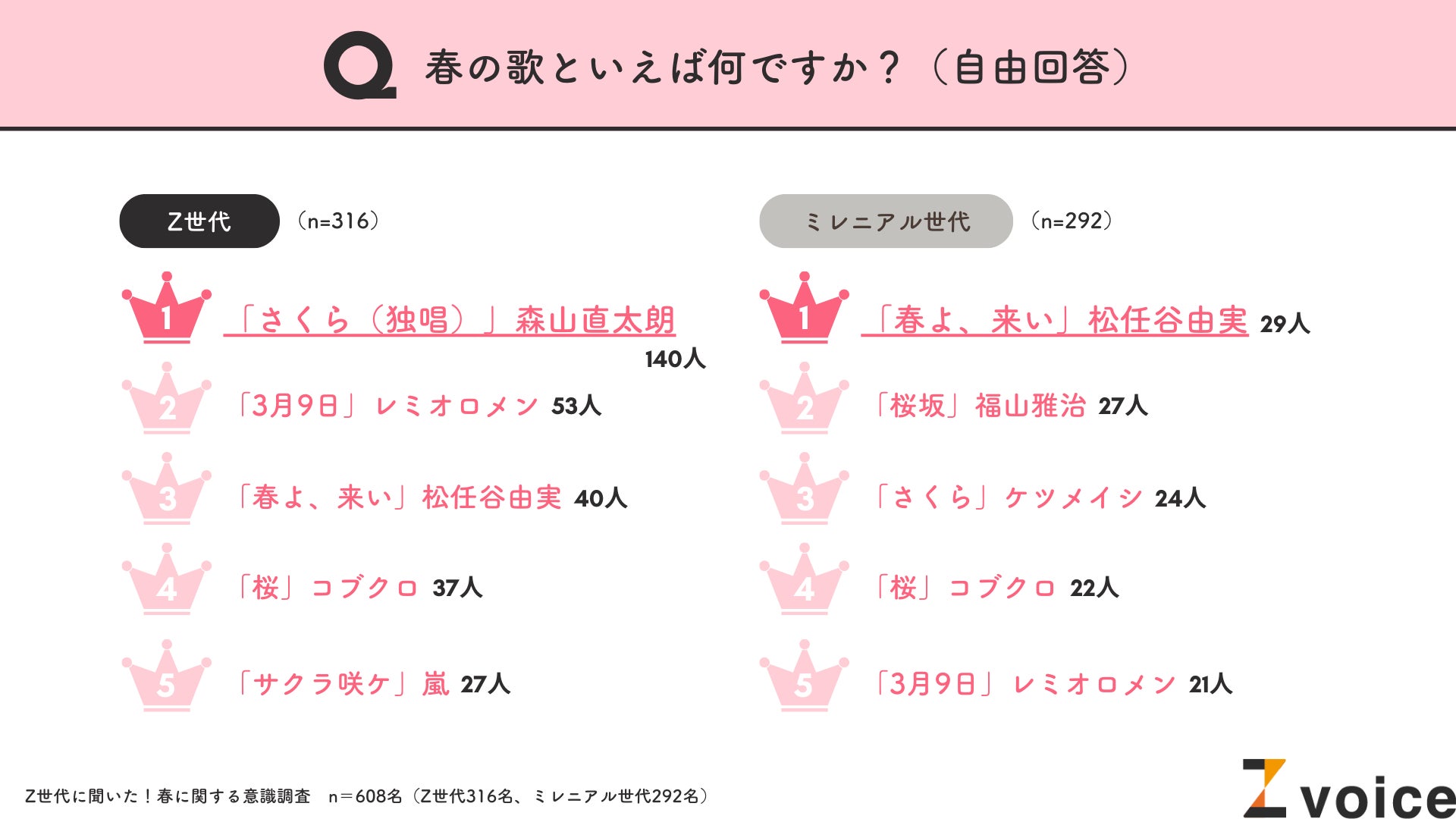 また、「春の歌といえば何ですか?」という質問に対して、Z世代の圧倒的1位は森山直太朗さんの「さくら(独唱)」であることが判明。