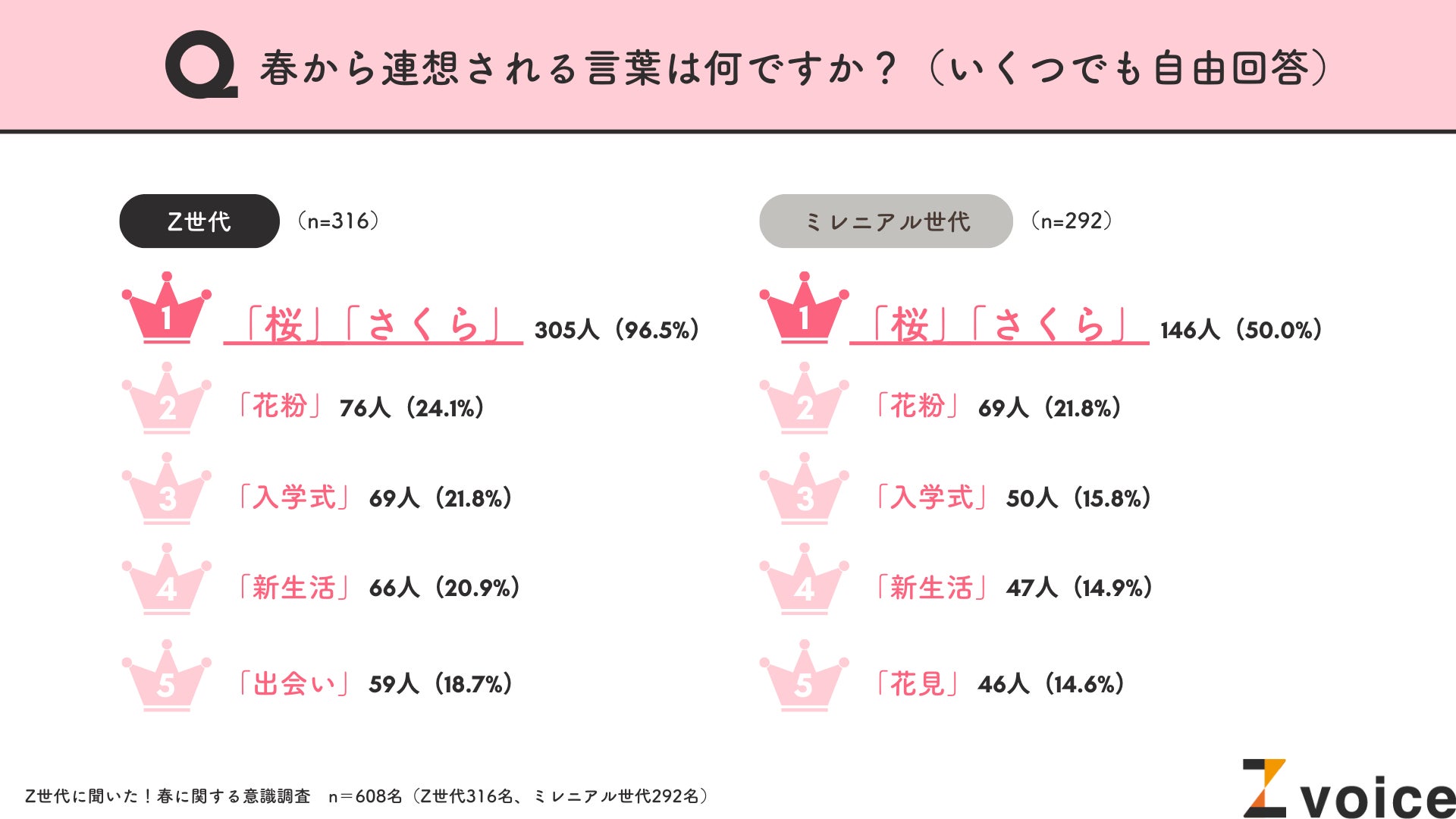 次に、春から連想される言葉を聞いたところ、Z世代とミレニアル世代どちらも1位は「桜」「さくら」との回答が。ただし、割合で比較するとミレニアル世代は50.0%に対して、Z世代は96.5%と回答に圧倒的な差が出ました。