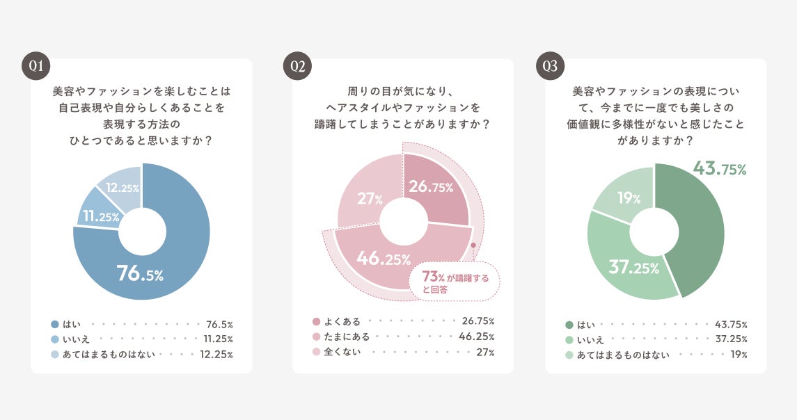 当社で行った「ヘアスタイル・ファッションの美容意識調査」*2によると、「美容やファッションを楽しむことは自己表現や自分らしくあることを表現する方法のひとつであると思いますか?」の質問に対し、76.5%が「はい」と回答している一方で、「周りの目が気になり、ヘアスタイルやファッションを躊躇してしまうことがありますか?」に対して「よくある」「たまにある」と73%が回答しています。