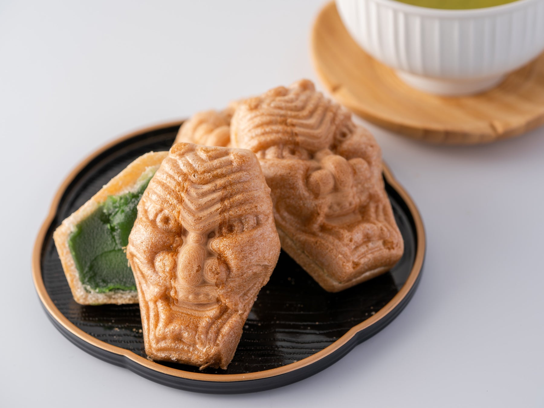 鹿島を代表する伝承芸能「面浮立」の踊りに使われる鬼面を模した型に、抹茶の香り豊かな餡をたっぷり詰め込んだ最中です。