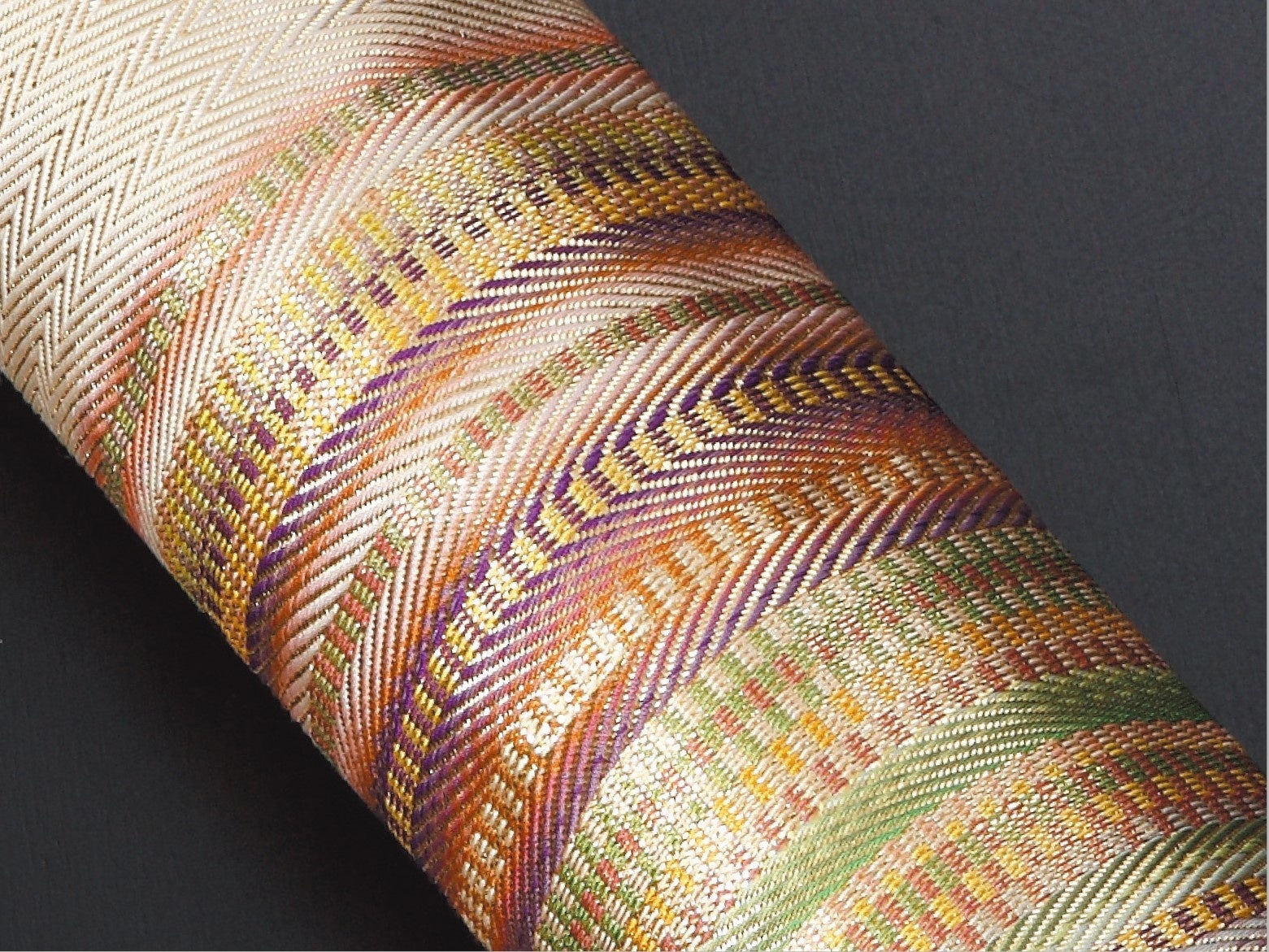 鹿島錦は、経糸(たていと)に上質な金銀漆の箔紙、緯糸(よこいと)に色とりどりの本絹糸を使った手織りの工芸品です。
