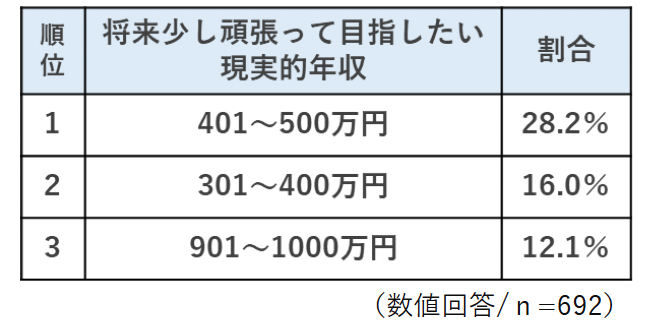 少し頑張って目指したい年収は、401~500万円のレンジが最も多い結果に
