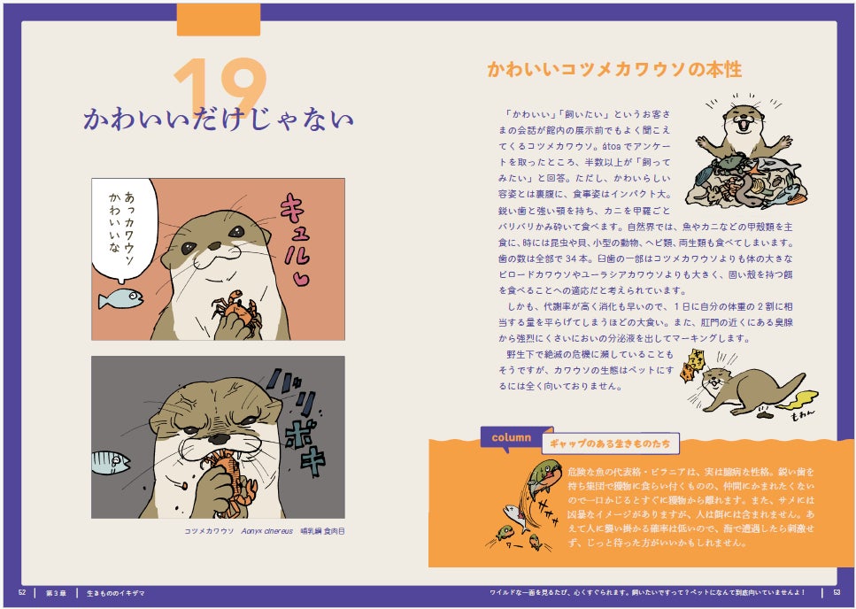 2コマ漫画に登場する生きものの特徴について、アトア飼育員が解説やコラムを執筆しました。