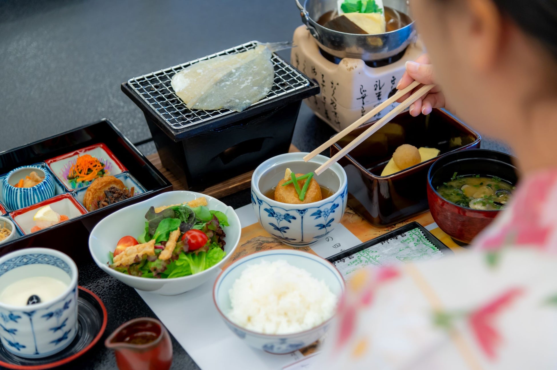 食材にこだわった和食をご提供しており、それぞれに趣の異なる和室の客室でお楽しみいただける部屋食や食事処広間席でのひとときは、ふたりの時間を大切にしたいカップルやご夫婦、小さなお子さま連れのご家族にもご好評いただいております。