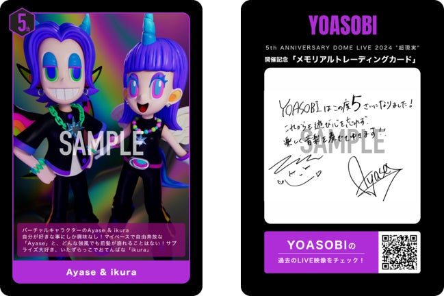 MIYASHITA PARK館内で、税込1,500円*お買い上げごとに1枚、YOASOBIの5周年記念デザイン、全5種類のトレーディングカードをランダムで配布いたします。裏面はYOASOBIの書き下ろしコメント入りとなっております。さらに、各デザインにそれぞれキラキラ光る「ホログラムバージョン」が低確率で出現します。