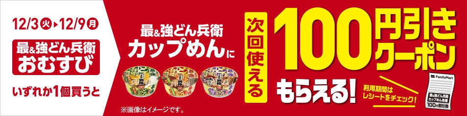 期間中に「最強どん兵衛 きつねむすび」「最強どん兵衛 かき揚げむすび」のいずれか1個を購入いただくと、「日清の最強どん兵衛(カップめん)」いずれか1品に次回使用できる100円引きクーポンがもらえます。