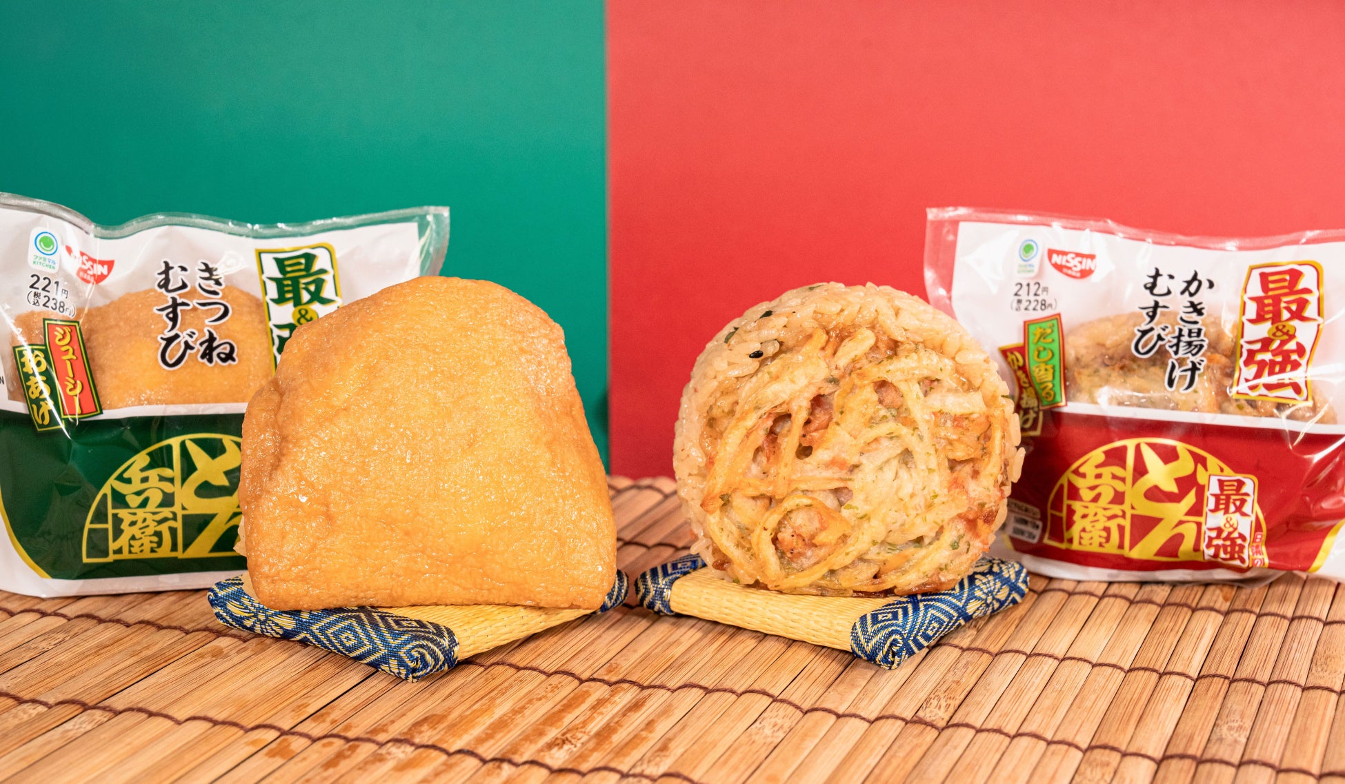 【内容】「日清の最強どん兵衛 きつねうどん」とのコラボおむすびです。おあげを分厚くジューシーに仕立てました。ごはんはこだわりの6種のだし(かつお節、煮干し、サバ節、昆布、椎茸、焼きあご)と、「八幡屋礒五郎」の「ゆず七味」を入れたタレで味付けし、おあげと相性抜群。最強の名に相応しい逸品です。