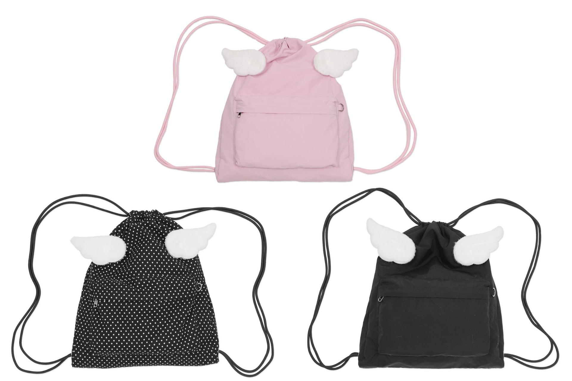 「珍しいドット柄ナップサックに、『空を飛ぶ気分』を演出する羽のアクセントを加えた遊び心あふれるデザインがこだわりポイントです。」