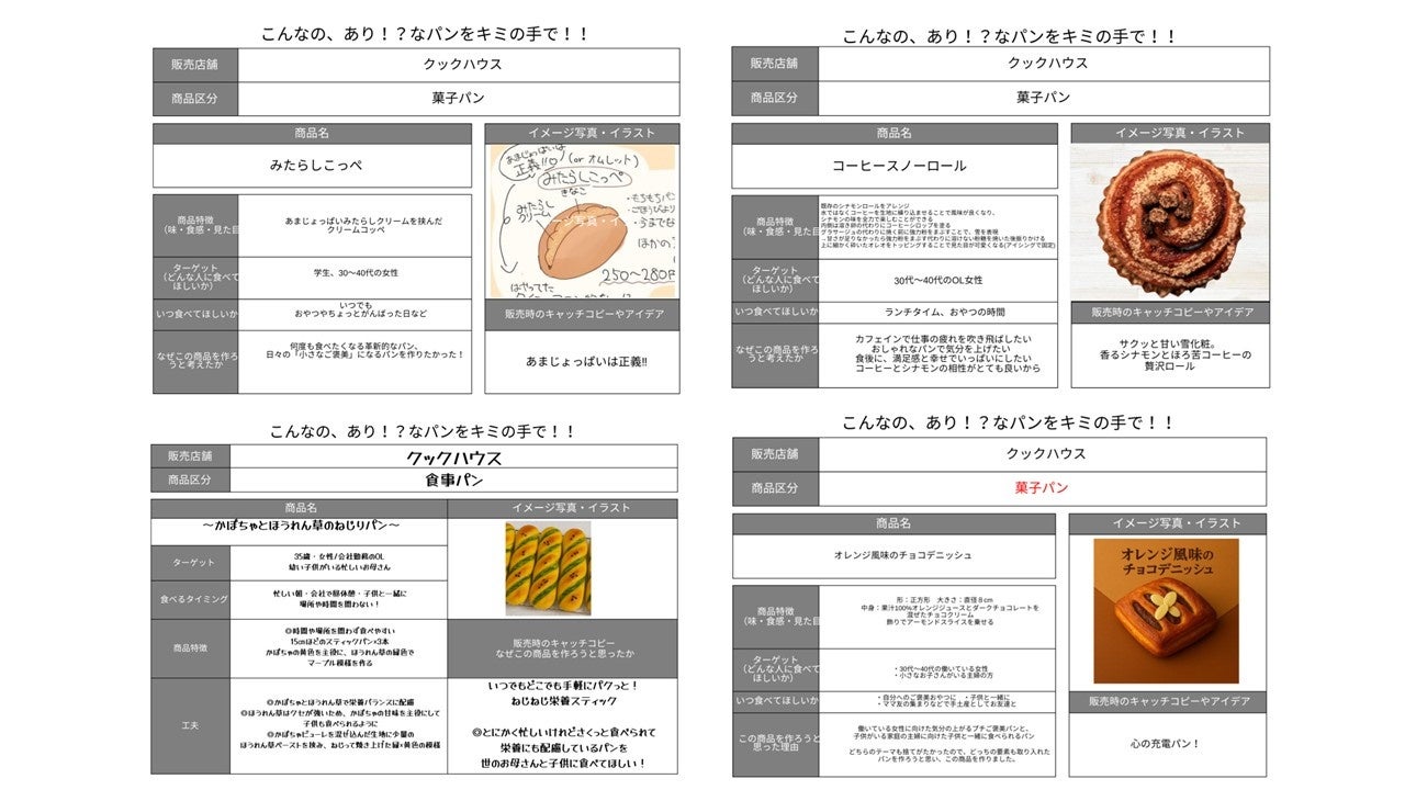 プログラムを通じて、製造工程や商品のネーミング、店舗での商品配置・陳列時間帯など、パンを販売するまでにたくさんの工程・工夫があることに初めて気づきました。今回の商品アイデアは、お客様が驚くような、新しいパンを考案したいという思いだけでなく、製造現場や企業・店舗のコンセプトに合うかも大切にして企画しました。