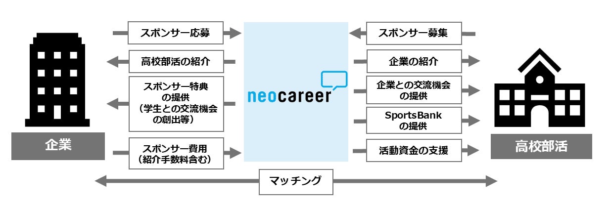 「Bスポンサーズ」は、企業と高校の部活動をつなぐスポンサーマッチングサービスです。企業はスポンサーとして参加し、資金提供や交流の場を通じて活動を支援します。高校の部活動側は、提供された資金を「SportsBank※」を通じて活用し、運営の効率化や活動の充実を図ります。ネオキャリアはこの仕組みを仲介し、企業と高校双方にとって持続可能で価値のある関係構築を支援します。高校生にとっては、企業との早期接点を通じたキャリア教育の機会となり、企業にとっては、将来を担う人材と出会い、関係性を築くきっかけにもなります。