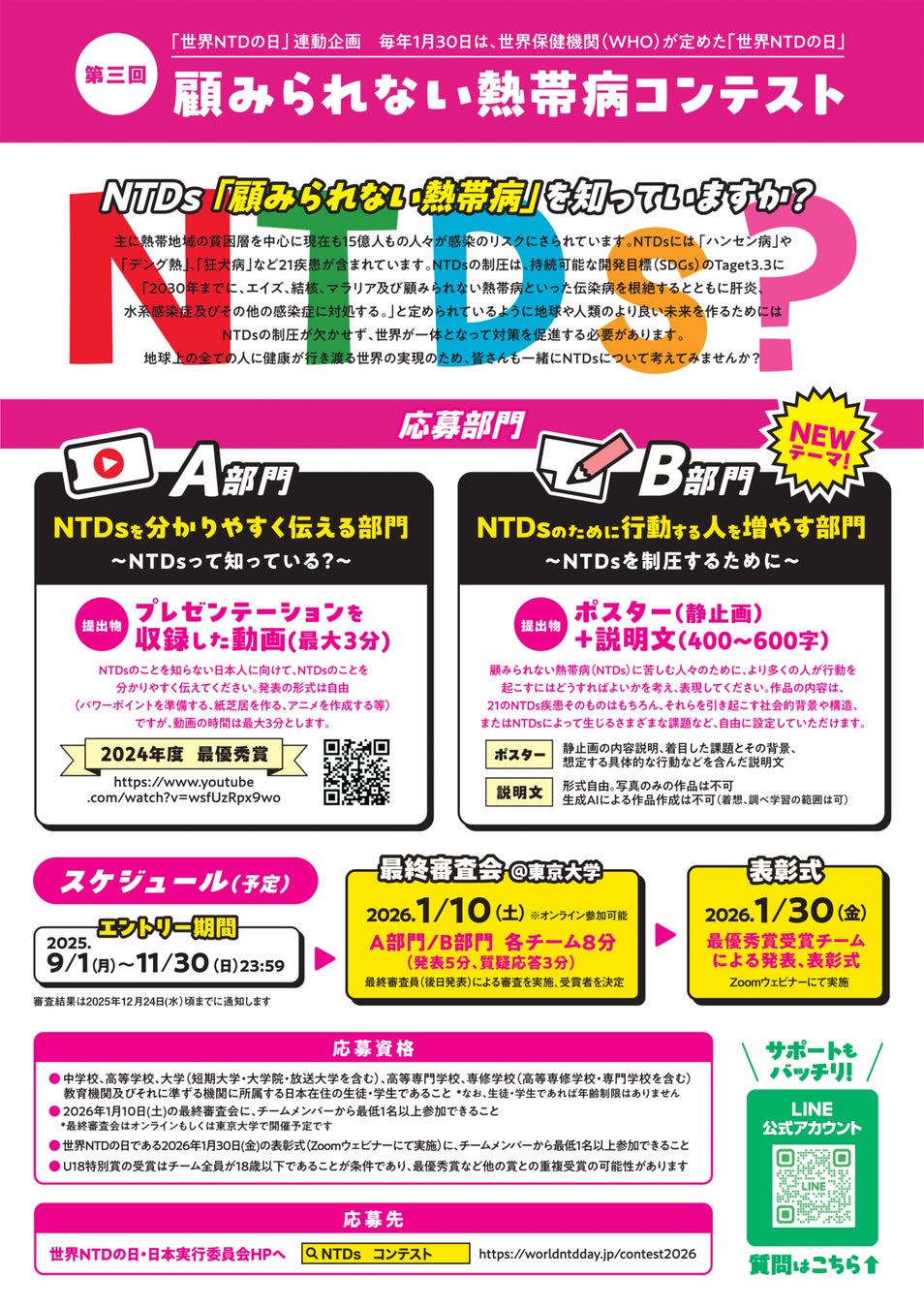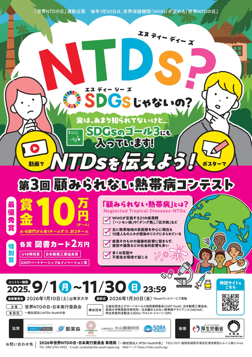 世界14億人以上に影響を与えている顧みられない熱帯病(Neglected Tropical Diseases: NTDs)※1の認知度拡大・政策提言活動を行っている一般社団法人NTDs Youthの会(事務所:福岡市博多区、代表理事:轟木亮太)は、「第三回 顧みられない熱帯病コンテスト(後援:外務省、厚生労働省)」における受賞者表彰式が行われたことをご報告いたします。本コンテストは、世界NTDの日2026・日本実行委員会主催のもと、一般社団法人NTDs Youthの会がコンテスト/ウェビナーの企画・運営を担当し、開催されました。