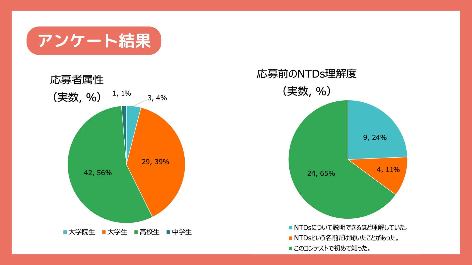 応募総数はA部門で16チーム(35名)、B部門で21チーム(40名)でした。応募者の中では高校生が過半数、次いで大学生が全体の4割を占めました。また、応募者の約6割がこのコンテストで初めてNTDsを知った生徒・学生でした。これらの応募者の中から、世界NTDの日・日本実行委員会による一次審査を通過した各部門6チームが最終審査会へ進みました。