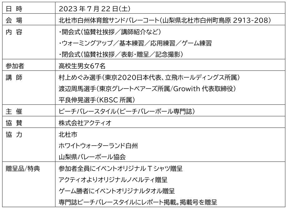 総合建設機械レンタルの株式会社アクティオは、ビーチバレースタイルが主催する、部活動でビーチバレーボールに取り組む中・高校生を対象にしたイベント「AKTIO アンダーエイジ・ビーチバレーボール・アカデミー」に冠協賛をしています。