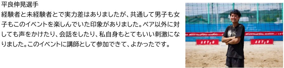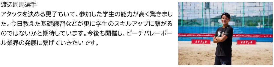 今回開催した「AKTIO アンダーエイジ・ビーチバレーボール・アカデミー」vol.4では、現役のプロビーチバレーボール選手が、部活動でビーチバレーボールやインドアのバレーボールに取り組む高校生を対象に、試合での戦略や戦術、コンビネーション、勝利への考え方などについて実践形式で指導をしたり、ゲーム練習を行いました。