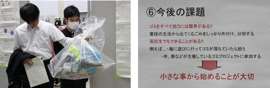 「海ゴミを拾って、海をきれいにして紹介する」チームは、「世界規模で海洋ごみが増え続けている現状に注目してこの探求分野を選んだ。海洋ごみ調査の結果を、実際のごみや写真で紹介することにより、自分たちがしないといけないこと、きれいな海を守っていく気持ちを啓発する。国内外からごみが漂着しているが、あきらかに国内のごみが目立ち、ポイ捨てが多いと感じた。この探求を行い、次の生徒や多くの方に伝えたいことは、ごみを拾うということはもちろん大切だが、ごみを捨てないことが大切で、啓発活動により、多くの方に地球環境、海洋ごみ問題の深刻な現状を知ってもらいたい。」と発表しています。