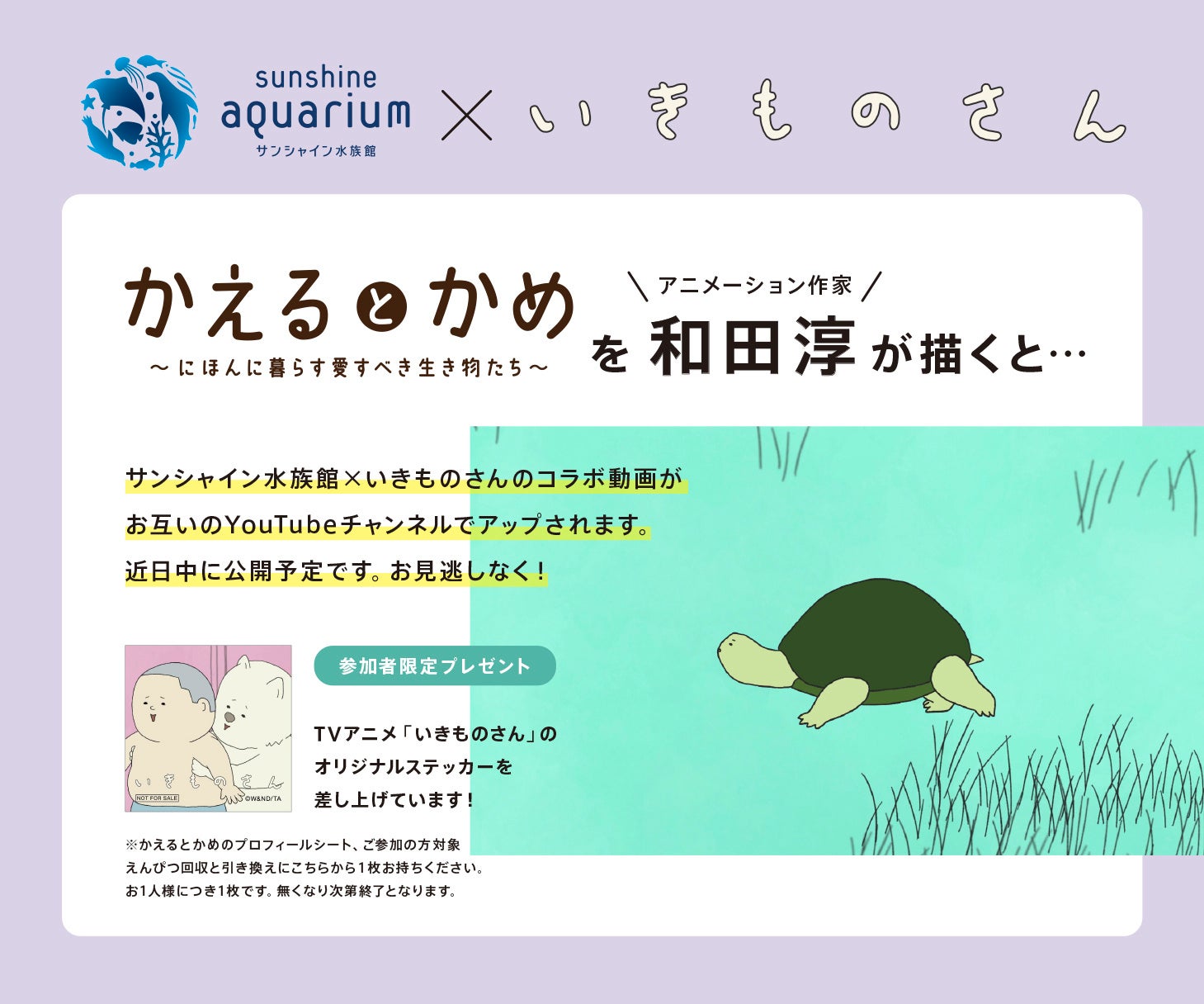 6月16日(金)~7月17日(月・祝)にサンシャイン水族館(東京・池袋)で開催されるイベント「かえるとかめ~にほんに暮らす愛すべき生き物たち~」とのコラボが決定しました。会期中にいきものさんとサンシャイン水族館のコラボ動画がそれぞれのYouTubeチャンネルで公開されます。またイベントにお越しいただき「かえるとかめのプロフィールシート」ご参加の方に「いきものさん」オリジナルステッカーをプレゼントいたします。是非お越しください。