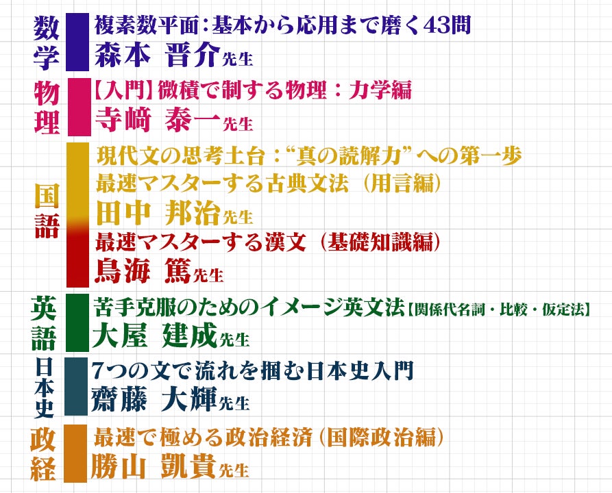 ゼロから全ての大学入試に通用するカリキュラムを作成。これから高校での授業に取り組む方から、受験勉強に向けた本格的な学習を始める方まで全ての人が対象全ての講座でカリキュラムを事前に公開。