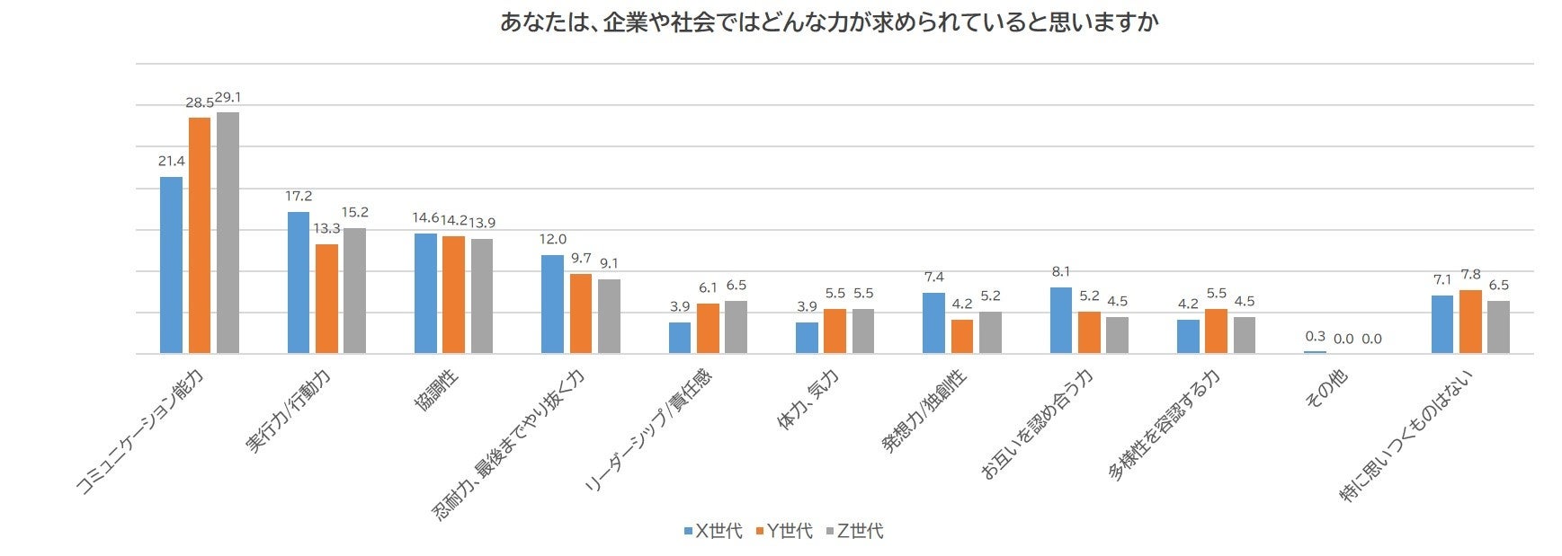 企業や社会で求められるスキルは全世代で「コミュニケーション能力」が圧倒的に高く、X世代からZ世代にかけて増加傾向にあります。また、X世代は「忍耐力、最後までやり抜く力」の回答がY・Z世代よりも多く、いわゆる“体育会系”の能力を重視していることが考えられます。