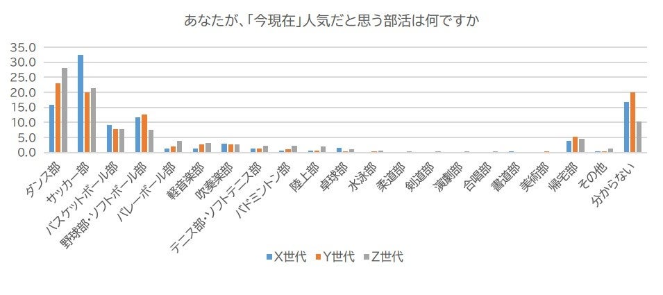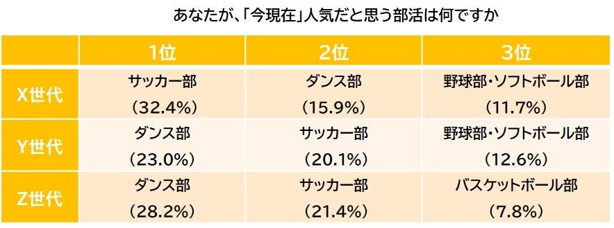 また、今現在人気だと思う部活は、ダンス部がY・Z世代で最も多く、Z世代においては2番目に多いサッカーと比べ6.8%高く、またX世代においてもサッカーに次いで2番目に多く、全世代から人気の部活動と認識されていることが分かりました。一方で、サッカーと野球は、X世代と比べ、Z世代で野球が4.3%、サッカーが11%低下しており、人気のある部活が多様化している傾向にあります。