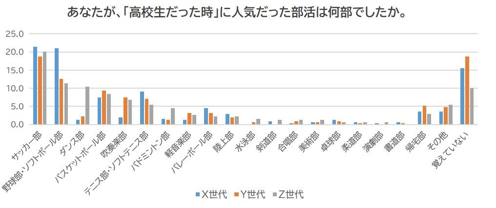 高校生の時人気だった部活は、全世代でサッカー部が最も多く、横ばいで推移しています。一方で、X世代で人気が高い野球・ソフトボール部、テニス・ソフトテニス部は、Z世代では半減。