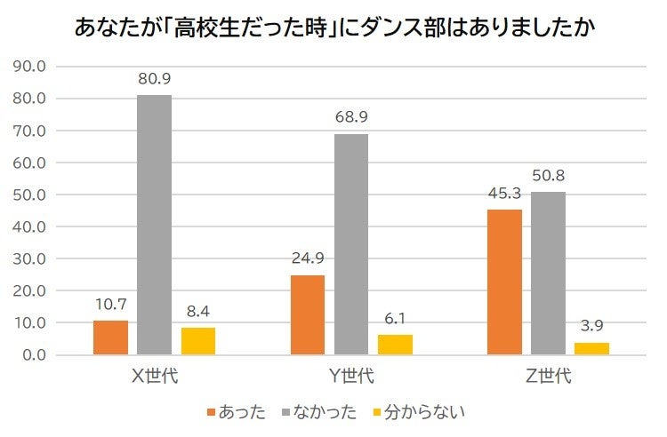 通っていた高校にダンス部があったと回答した割合は、X世代が約10人に1人という結果に対し、Z世代では約2人に1人となり、約5倍に増加しました。