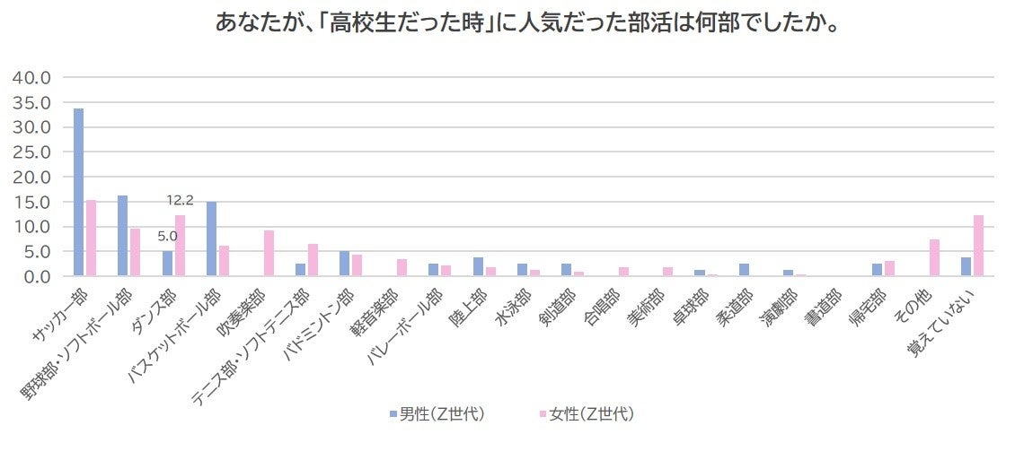 また、X世代と比べZ世代で人気が高まったのは、ダンス部と吹奏楽部で、ダンス部は1.3%から10.4%、吹奏楽部の1.9%から6.8%に増加しており、若い世代での人気が急増していることが分かりました。さらにZ世代の男女別でみると女性は12.2%と、女性人気が比較的高い。